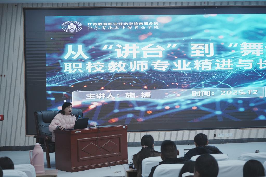 科研处处长施捷围绕教师职业成长作了题为《从“讲台”到“舞台”——职校教师专业精进与长远规划》专题讲座,为职校教师职业发展提供了系统指导。